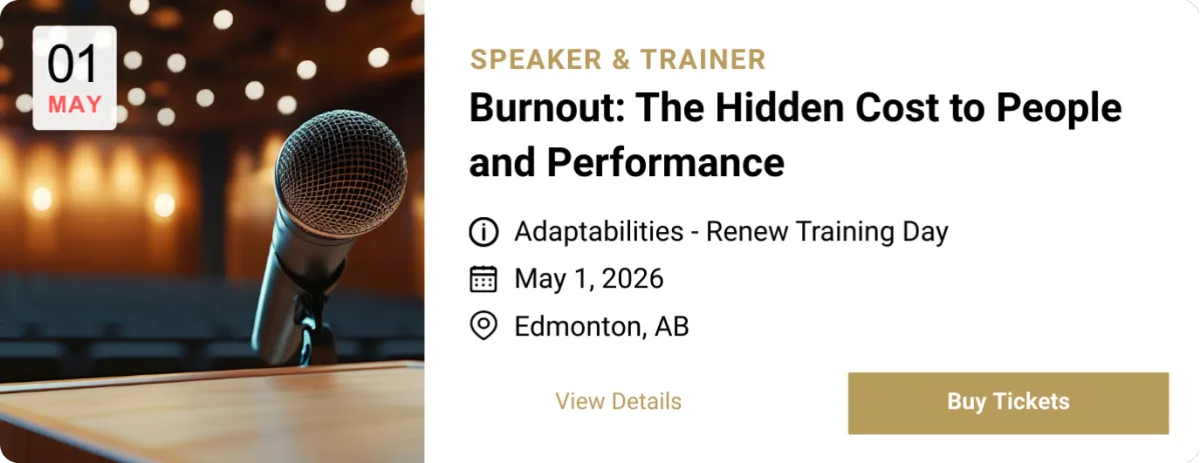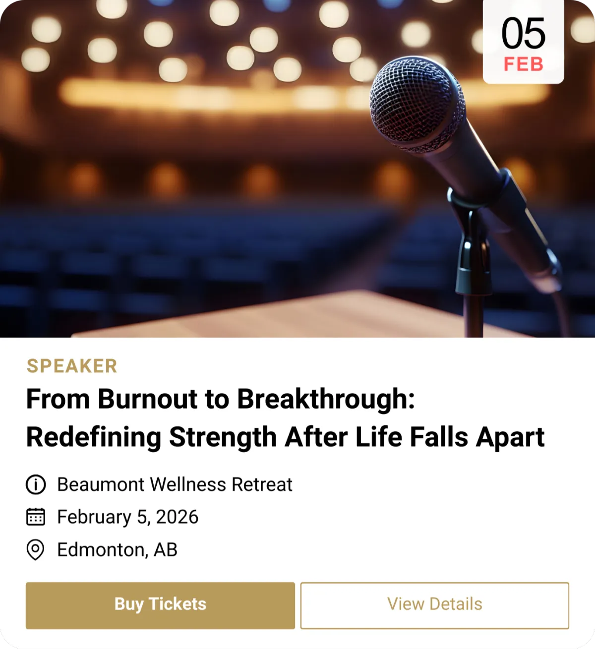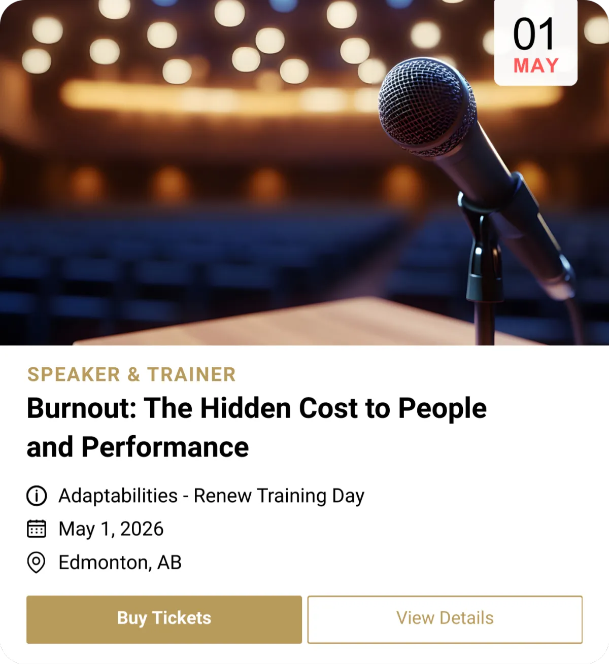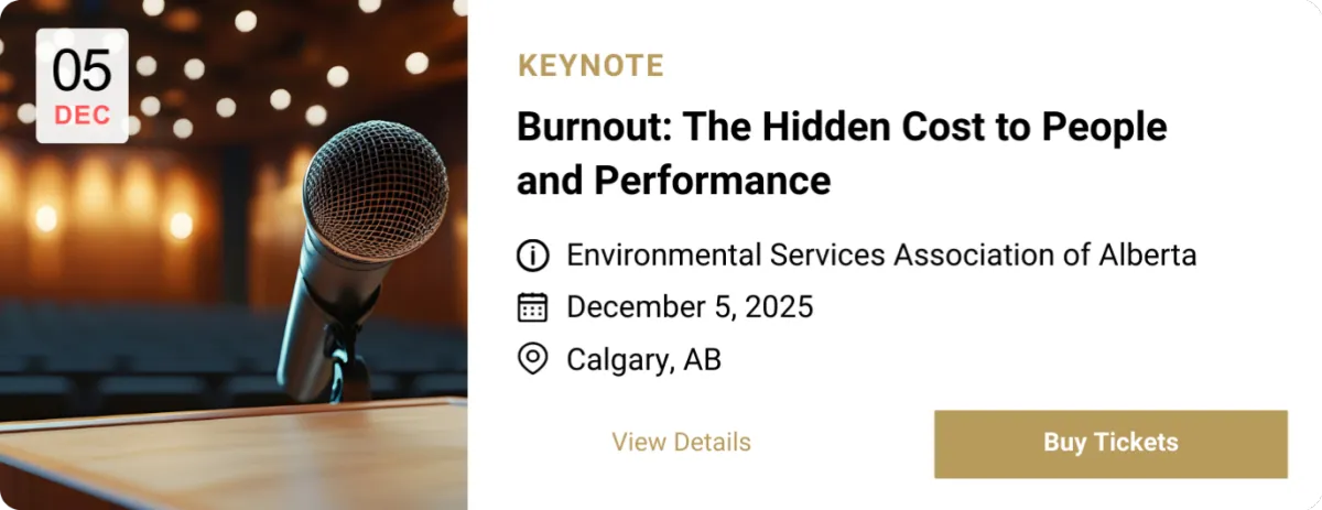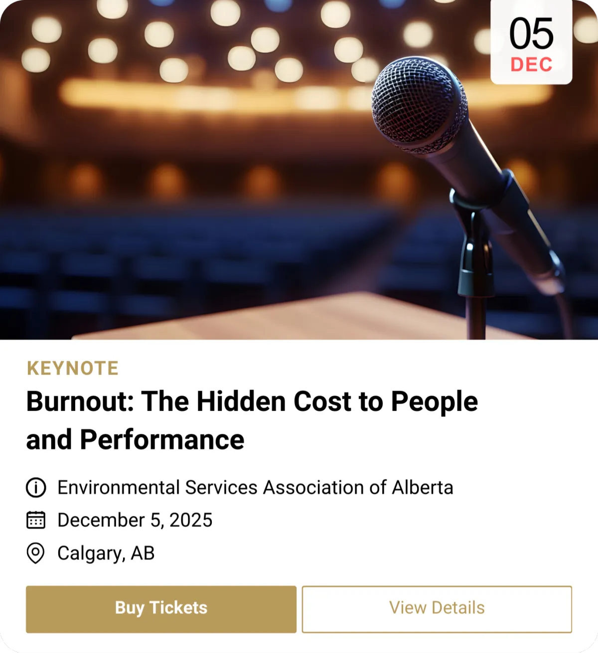 On stage, I share honest stories and practical tools that help leaders rethink burnout, responsibility, and how they manage their energy and capacity.